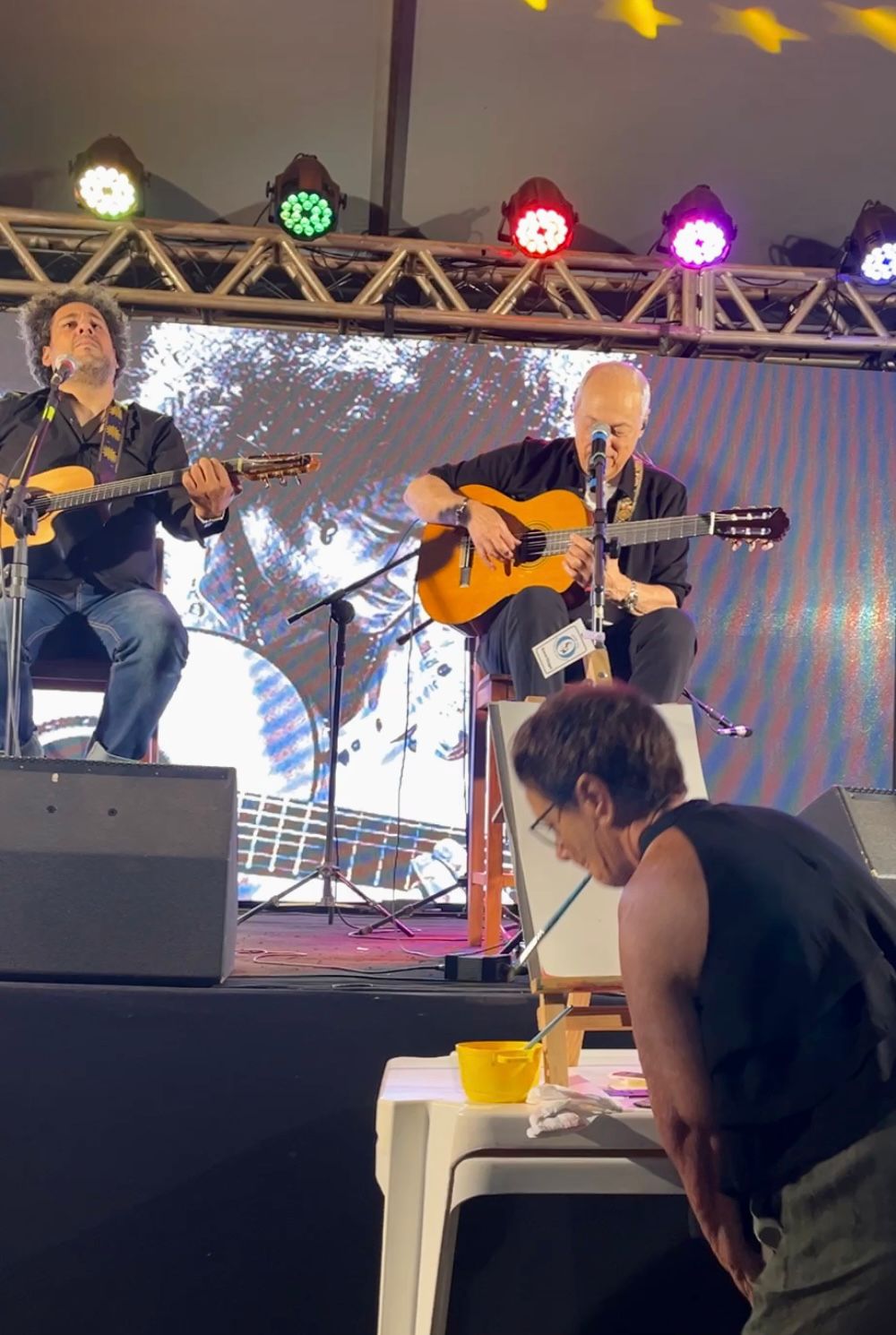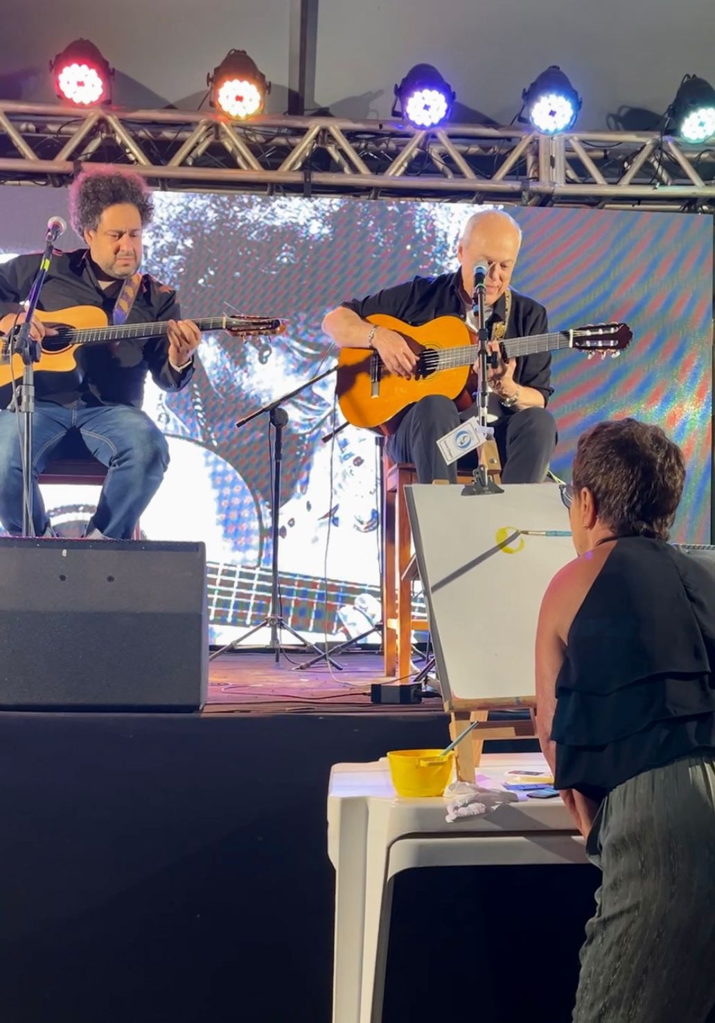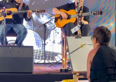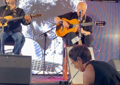 Porém, o momento mais inusitado e inesquecível aconteceu durante o show conduzido por Diego Figueiredo: ao som de Aquarela do Brasil, interpretada pelo próprio Toquinho, Goret pintou uma aquarela ao vivo, unindo música e arte em uma apresentação emocionante.